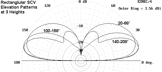 On the very dubious assumption that we have some choice in how high to place the rectangle, we can also use elevation patterns of the antenna as a guide. Figure 5 provides three patterns with the bottom wire at 20' up, 100' up, and 140' up. The decrease in gain with the 140' pattern is already evident, along with the reason for that decrease. Above the height for maximum gain, a secondary lobe begins to appear at a very high angle. With sufficient elevation (above 1/2 wavelength or so), the secondary lobe becomes dominant and the overall low angle gain of the antenna begins to decrease dramatically. However, I doubt anyone will ever test this modeling result by placing the bottom wire of the rectangle above 270' up.