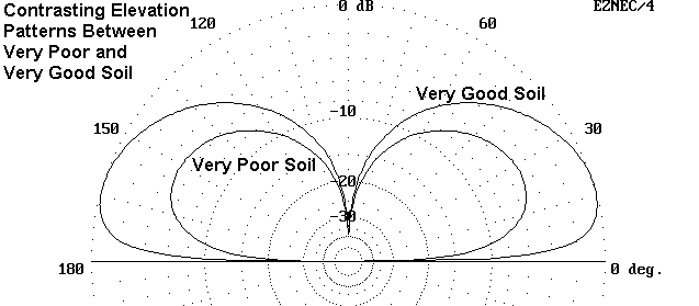The better the distant soil, the better the low angle radiation from the antenna. Figure 8 shows the contrast between very poor and very good soil. Equally important with the gain improvement is the lowered angle of maximum radiation. Were the curves graphically equalized, the higher-angle response would be very little different. However, the low-angle response from the antenna over very good soil is very much enhanced. Intermediate soil types provide intermediate curve shapes.