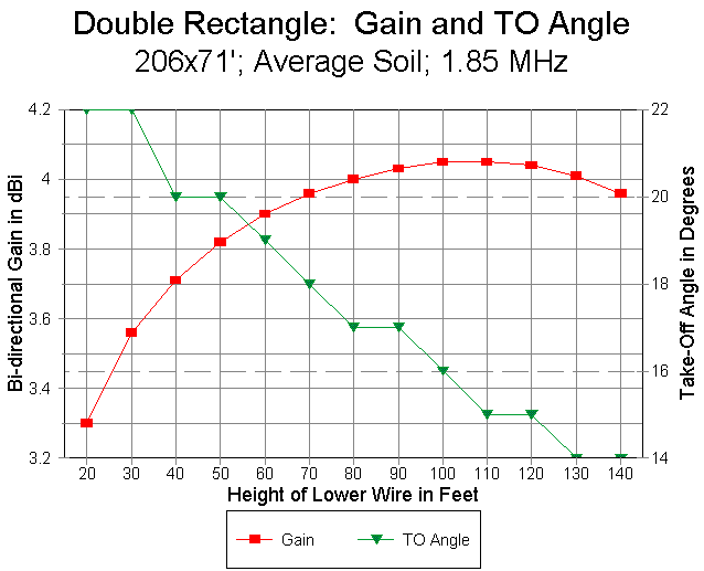 The double rectangle exhibits almost a half dB of additional gain beyond that of the single rectangle. Figure 9 shows the gain and take-off angle for lower-wire heights from 20' to 140' up, which permits direct comparison with the corresponding chart for the single rectangle. The curves are highly congruent, with peak gain at about 100' up (with the top wire at 171' up). Since the resolution of take-off angles is one degree, the "stair-step" form of that curve should be no surprise, and 1-degree differences between the graphs for the single and double rectangles are meaningless.