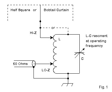 The circuit for effectively feeding a voltage node of the open-ended SCVs is in Fig. 1. The top--or a tap near the top--goes to one of the half square verticals or to the middle vertical of the bobtail curtain. This remote circuit can be set and weather sealed. If the tips of the vertical are a significant distance above ground, then the center wire of the bobtail may be extended toward the ground. The matching tank circuit is then positioned so that its lower end forms a contact with a good RF ground (which is not the same as a radial system). The current magnitude at the top of the tank circuit will be higher than at the tip of an end vertical, but it will reach close to the zero point in line with those end-vertical tips. Maximum current will still be at the tops of the verticals, where they join the horizontal wire. The maximum center-vertical current magnitude, of course, will be twice the maximum magnitude of the end verticals on a Bobtail current. On a half square, the two top vertical currents will be about equal.