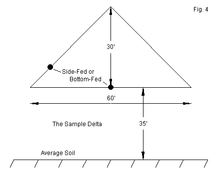 Just for initial comparative purposes, Table 2 provides some numbers for a right-angle delta, resonant for SCV use at 7.15 MHz, with its base at 35' and its apex at 65' up over average soil, as sketched in Fig. 4. The first numbers list the gain, take-off angle, and source impedance if we attempt to feed the antenna on all bands at the SCV side feedpoint, about 12% up the triangle leg. The second set give the same modeled data if we feed the antenna at the center of its horizontal base leg.