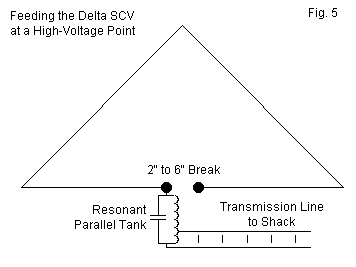 We shall leave one end of the wire at the bottom-center break unattached to anything. The other end, we shall attach to the very same parallel tuned circuit we might used to voltage feed a bobtail curtain. The antenna source impedance will be complex and high, with the resistive component in the 3500 to 4000 Ohm range and the reactance between 8000 and 10000 Ohms. A good high-Q coil with well-spaced turns to prevent arcing and a good variable capacitor, also with wide spacing between plates, will handle the job easily. The only task is patiently finding the right tap points for both the antenna and the feedline so that a coax line sees 50 Ohms.
