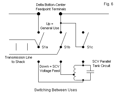 We shall still need a weather proof case for the capacitor and the coil. So we might as well add either a knife switch for manual operation or a relay for remote operation. The switching job is this: when we wish to use the antenna as an SCV, one side of the base-leg break goes to the tank circuit and the other goes to nothing. The feed line goes across the tap(s) on the coil. When we wish to use the antenna for general operation, the tank is disconnected and each side of the base-leg break goes to each side of the parallel feed line. The switching, suggested in Fig. 6, may require 3 sets of contacts.