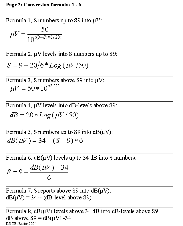 The following graphic presents the table exactly as I received it, including the European convention of using a "," instead of the U.S. "." to represent a decimal. I have not wished to change anything in the table. However, I shall update the table should I receive a revision from DARC or any U.S. regulatory source accepting a similar standard. An alternative version (from IARU Region 1 Recommendation R1, 1990) appears in Tabelle 4 and Tabelle 5 of the 2006 Funkamateur article referenced earlier in these notes. The differences are small, mostly representing a rounding of values. However, Tabelle 5 is interesting since it presents an alternative set of values for frequencies above 30 MHz. Values for the upper range are 0.1 times the received voltages for HF, a change of 20 dB. A second difference is that the magazine tables omit S0.