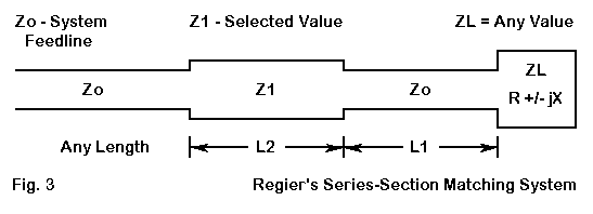Taking any load that is not matched to a desired feed line, we may attach a specific length of the desired feedline. That specific length will transform the impedance to another value. That value will, in turn, be transformed by the second line of a certain characteristic impedance to a value that is a match with the desired system feedline. The two lengths of line for the series matching sections depend on frequency, and the solution is frequency specific with a certain operating band width. The lengths are also dependent on the characteristic impedance selected for the special section of line.