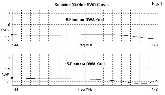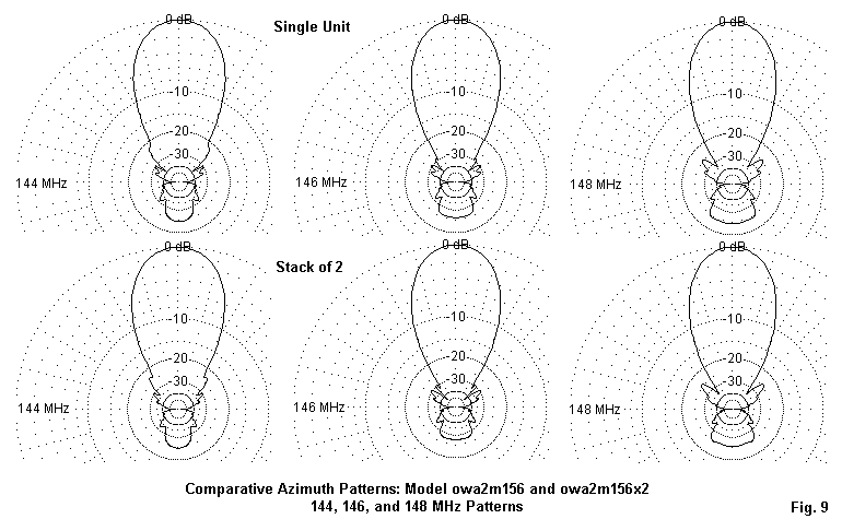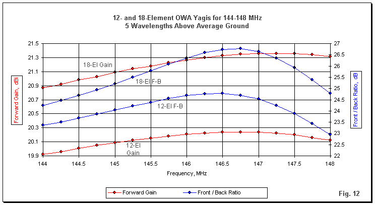 The 12-element OWA Yagi show both peak gain and peak front-to-back ratio at 146.5 MHz. For the 18-element version of the antenna, peak gain occurs at 147.25 MHz, while peak front-to-back ratio appears at 146.75 MHz. As Yagi designs go, both sets of figures represent well-centered curves that minimize differences at the band edges. The centering of the front-to-back curves (especially) may be resonsible for the constant value of separation for stacked-Yagi maximum and minimum front-to-back ratios. The free-space tables show that ground effects are not responsible for those values or their relative constancy across the range of Yagi boom lengths.