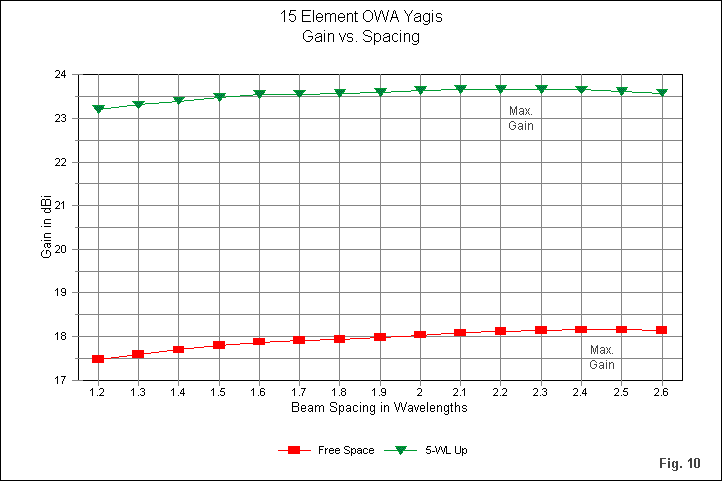 As we move downward to the 15-element OWA Yagi, we encounter a more significant difference in the required spacing for maximum gain. Contrary to possible expectations, the free-space model does not show a smaller required spacing for maximum gain. Instead, the free-space model requires a wider spacing, as shown in Table 10 and in Fig. 10.