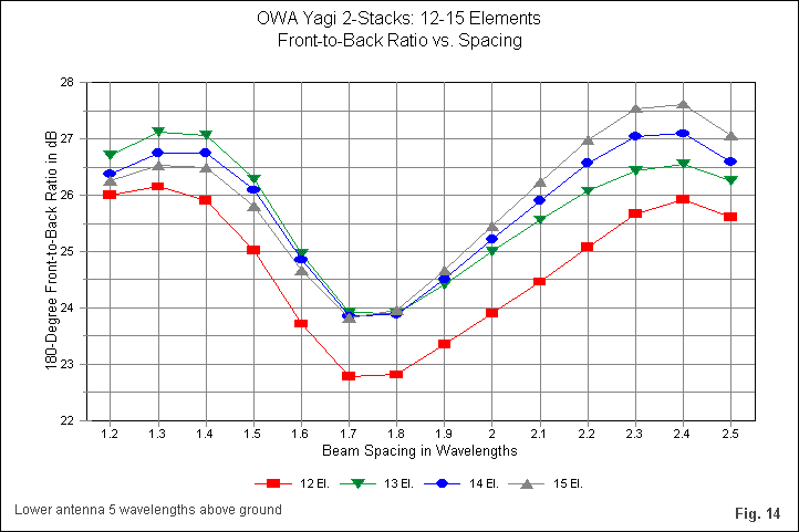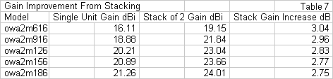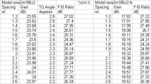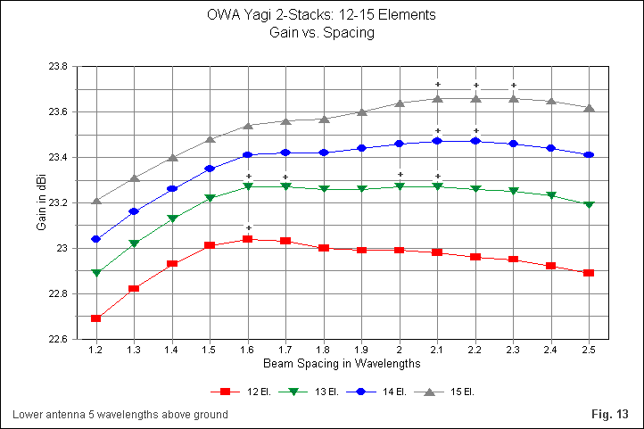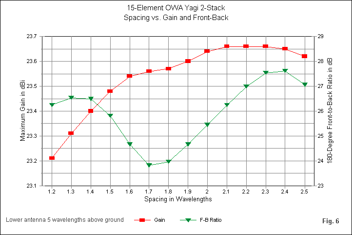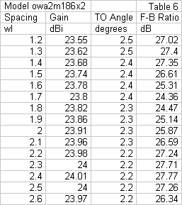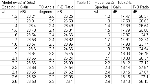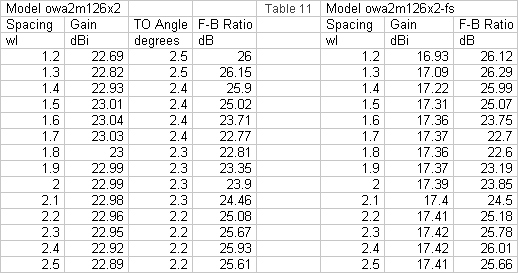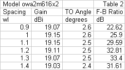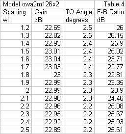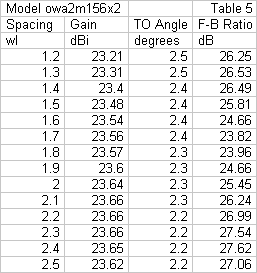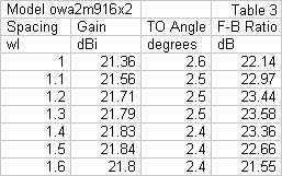 Model owa2m156x2: Even though the boomlength of the 15-element Yagi is 40% longer than the length of the 12-element design, the gain increase for a single unit is only about 0.7 dB. Theoretically, we should see an even smaller increment in spacing increase to achieve maximum gain. However, the actual required spacing--as shown in Table 5 and in Fig. 6--is considerably larger: between 2.1 and 2.3 wavelengths.