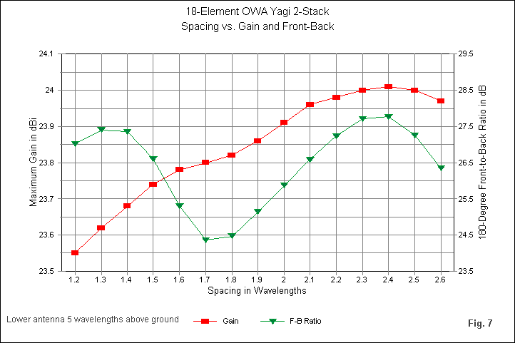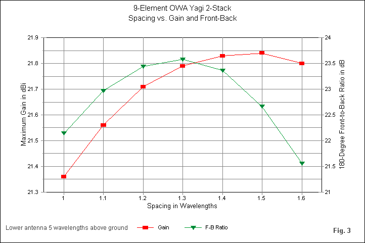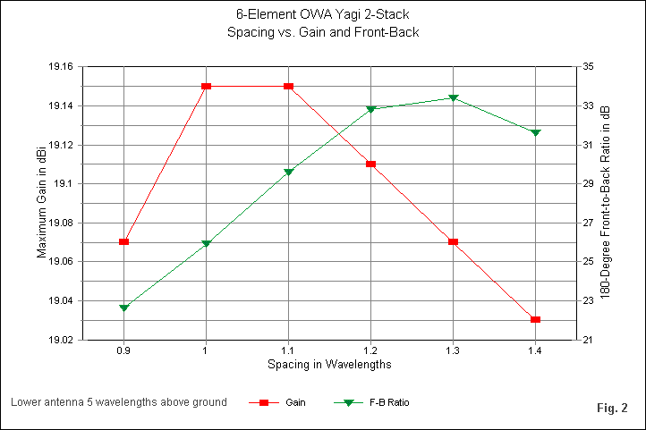 The net effect for the set of Yagis is a stacking-space region of some interest. If the single unit gain is only a bit lower, the required stacking space for maximum gain is smaller than previous spacing increments would suggest. However, with only a small increase of gain, the required spacing "jumps" to a larger-than-expected values. Once over the "forbidden" zone between 1.8 and 2.0 wavelength spacing, we might anticipate a smaller increment for the next Yagi in the set.
