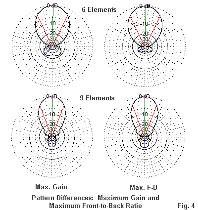 The differences in the designs of the 6-element and 9-element Yagis yield different patterns for the rear quadrants. As a result, the difference between a maximum gain and a maximum front-to-back spacing have diffeent effects on the rearward pattern. Fig. 4 shows something of the difference. The 9-element design (along with all of the larger Yagis in the set) has a single major rearward lobe with only small sidelobes. Hence, the 180-degree front-to-back ratio and the worst-case front-to-back ratio are the same. The range of variation from minimum to maximum front-to-back ratio is only about 3.5 db at worst.