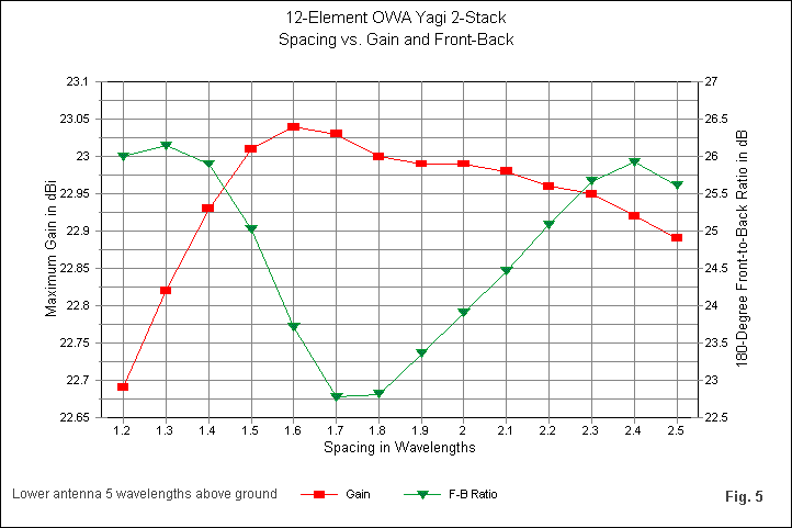 The model whose base height is 5 wavelengths above ground shows a broad peak gain between 2.1 and 2.3 wavelengths spacing. However, the free-space version places the optimal separation for maximum gain between 2.4 and 2.5 wavelengths. In both cases, the adjacent values are sufficiently close to optimal so the the difference has no great significance in practice. However, the fact that it is counter-intuitive does have some significance. Rather than expanding the stack spacing, ground effects appear to narrow it slightly for some longer-boom Yagis.
