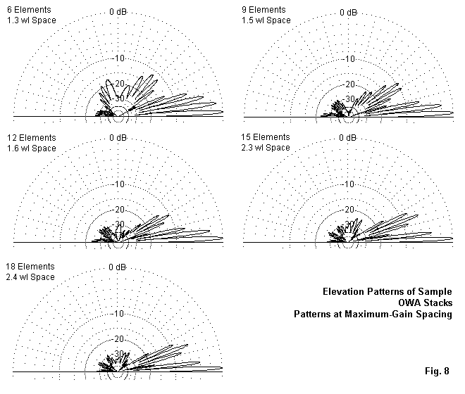 Many stack users are unfamiliar with the elevation patterns that emerge from stacks. An individual Yagi beam tends to produce a series of lobes at regular angular intervals. A stack, however, produces an irregular elevation pattern, as shown in the patterns for the test beams in Fig. 8. The interactions between vertically spaced elements both locally and at the points where the individual patterns merge (including both incident and reflected components) result in deep nulls that tend to vary with the individual beam gain values and with the spacing between them. As we increase the spacing between the beams, the number of lobes lower than the first major stack-null tends to decrease.