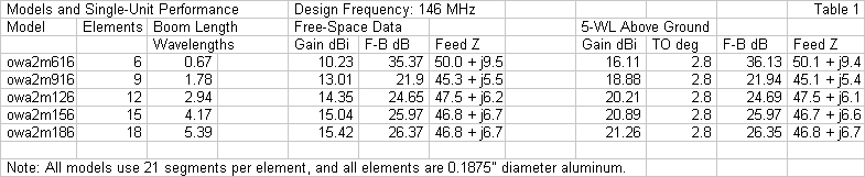 From the total family, I selected Yagis having 6, 9, 12, 15, and 18 elements. Table 1 shows the modeled performance of single units both in free space and at a height of 5 wavelengths above average ground at the design frequency of 146 MHz. The individual Yagis cover the entire 2-meter band with only small changes in values between maximum and minimum values. The boomlengths vary from 0.67 wavelength for the smallest Yagi in the set up to 5.39 wavelengths for the 18-element version. Gain is largely a function of boomlength rather than the number of elements. Hence the rate of gain increase dwindles rapidly for the longest members of the family. However, the selection will prove useful in eliciting some significant factors in the separation of Yagis in a stack of 2.