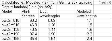 Finally, we should return to the equation for calculating the optimal beam separation for a stack of 2 Yagis. Table 8 shows the calculated and the modeled spacing required for each beam in the test series. The calculated optimal spacing is based on a regular sin function of the free-space H-plane (vertical) beamwidth. For the calculations, the vertical beamwidth is derived from a free-space model of the array.