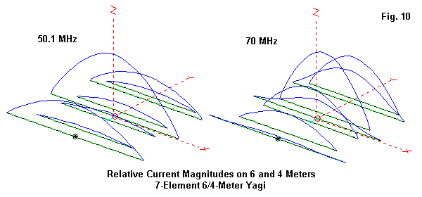 The directors are our primary focus. The first 70-MHz director shows a very high current level and in fact operates somewhat as a slaved 2nd driver for the array. Even more interesting is the 6-meter director, which has very significant current on it, even though dominated by the 4-meter director immediately ahead of it. One could make a case for adding a director behind the 6-meter director to "capture" the mutual coupling from the preceding director. However, since the array provided adequate performance without the missing director, I omitted it. (The added director will broaden the bandwidth and slightly increase the front-to-back ratio. Since 4 meters is such a narrow band, I let construction simplicity outweigh these small improvements. However, if you decide to experiment by modeling the array with an added 70-MHz director just short of the 6-meter director, you should be aware that the new director will requires adjustments to the length and spacing of nearly every element in the array.)