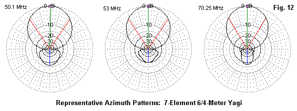 As well, the azimuth patterns for the array are quite well behaved, with patterns typical of a dual-band Yagi. See Fig. 12 for some representative examples.
