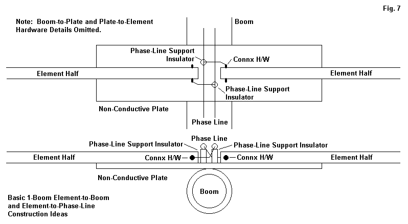There are no special notes for construction of the Yagi, since it follows standard handbook practices. The modeled dimensions presume that the elements are well insulated and isolated from a conductive boom. Hence, the plate technique shown for the 1-boom LPDA is completely adaptable to the Yagi.