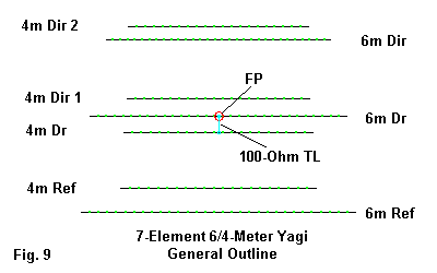 In Fig. 9, we can see the general layout of the array. It uses 3 elements on 6 meters. The elements are set for very wide-band operation that covers all of the 6-meter band with about 7 dBi of free-space gain and an average front-to-back ratio of nearly 20 dB. We can get more gain from three elements on the boom size we are using, but I opted for a bit less gain and more operating bandwidth. The full beam dimensions--in model format--appear at the end of these notes. Once more, all elements are specified as 1/2" diameter. However, on the 6-meter elements, you can use inner sections of 5/8" diameter tubes. Likely the only needed change will be a slight readjustment of the 6-meter driver to obtain under 2:1 50-Ohm SWR at both ends of 6 meters.