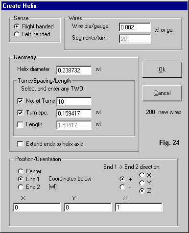 Fig. 24 shows the EZNEC helix-creation sub-screen. Essentially, it allows entering the same set of variables as the GH command in either NEC-2 or NEC-4. However, the output is a set of 200 wires, each a GW entry. The wire-grid structure for this exercise is 1.2WL by 1.2WL on a side, with the wires spaced at 0.1WL intervals. Wire 1 of the helix shifts from its position on the X-axis as created to the nearest intersection of wires, normally either X=0.1 or X=0.2.