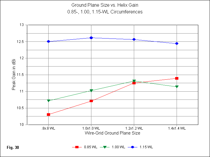 Within the context of square ground planes, the 1.2WL by 1.2WL wire grid used in the survey of 12° helices was both arbitrary and reasonable. I selected a size that I presumed was large enough to perform well in its function. However, without comparators, the ground plane that I used is not certifiably the best. To see if there might be a better size, I performed a final survey using 4 different square ground planes, with sides that are 0.8WL, 1.0WL, a.2WL, and 1.4WL long. Fig 29 shows their relative sizes with respect to a standard helix.