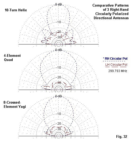 The Yagi has a front-to-sidelobe ratio of about 16.6 dB. The corresponding ratio for the quad is about 14 dB. In contrast, the axial-mode helix has a front-to-sidelobe ratio of only 11.1 dB. Note the improvement of the sidelobe performance relative to the models over perfect ground. The elevated 10-turn helix shows a front-to-sidelobe ratio improvement of about 1.6 dB. Nevertheless, the helical antenna sidelobe structure bears watching. Equally important is the distribution of energy to the sides. For this purpose, I remodeled the helix (along with the quad and Yagi) in EZNEC Pro/4, since it provides pattern plots that distinguish the left-hand and right-hand circular polarization of any test antenna. Fig. 32 shows the plots for the three sample antennas.