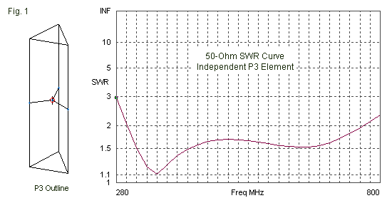 The P3 driver element emerged from the work of Dan Handelsman and David Jefferies. See the original article for a bibliography of articles on the prismatic polyhedrons. The P3 consists of 3 dipoles, each center fed, with triangular junctions at the outer ends. Unlike a cage dipole, where we draw the cage to a center feedpoint, the P3 uses continuous elements. From the center of each element to a central feedpoint, we employ short transmission lines, all the same length and impedance. Thus, we end up with three dipoles fed in phase with relatively close spacing and connected outer ends. Fig. 1 shows the general outline, plus a free-space 50-Ohm SWR curve.