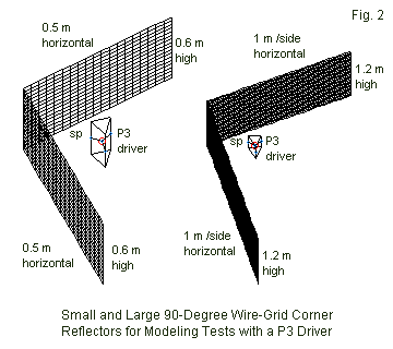 Like the planar reflectors shown in the earlier article, it is necessary to create wire-grid corner reflectors at 800 MHz so that the structure will not be self-resonant at any frequency within the sampling range (300 to 800 MHz). Because each grid segment will be shorter than had we set the wire-grid design frequency at 300 MHz, the models acquire considerable size very rapidly. Therefore, I settled on two reflector sizes to use in these initial notes, which form at most an initial feasibility study. Fig. 2 outlines the two reflectors.