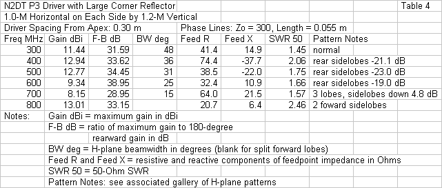These initial modeling studies suggest that the P3 driver may in fact provide wider-band directional performance with a corner reflector than with a planar reflector. With a planar reflector, the effects of changing the spacing between the driver and the reflector yielded opposing tendencies with respect to SWR on the one hand and to radiation patterns on the other. In contrast, a 90-degree corner reflector appears to yield usable SWR curves and a set of radiation patterns that are acceptable at least through 600 MHz, that is, through a 2:1 frequency range. These results use fairly tight criteria of acceptance. Although some past corner-reflector arrays have claimed a 2:1 frequency range, the results appear to rest on relaxed SWR requirements associated with television reception (in ancient times that required outdoor antennas). The results shown in these preliminary notes use a 2:1 SWR limit with a 50-Ohm reference. As well, the gain values--with an adequately sized reflector--are close to normal for comparable narrow-band reflector arrays.