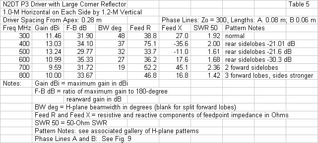 Table 1 does show evidence that the corner reflector falls short of optimal size at the lower end of the operating spectrum. Maximum gain for patterns with a single forward lobe occurs at 600 MHz. For reference, the corner size is about 1 wavelength per side horizontally and about 1.2 wavelengths in height at that frequency. Nevertheless, the relatively strong rear sidelobes in the patterns at the middle frequencies indicate two problems. First, the reflector remains somewhat undersized when compared to ideal dimensions. Second, at 600 MHz, the driver is about 0.6 wavelength forward of the corner apex, a considerable distance if a tight pattern is desired.