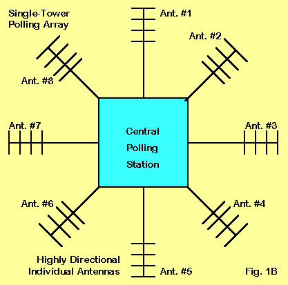 The principle of this system is to use a collection of relatively high gain antennas--such as multi-element Yagis--in a polling system located at atop a single tower. The number of antennas required is a direct function of the gain of the individual antennas. More accurately, the number is determined by the horizontal beamwidth so that coverage is overlapping with no excluded sectors. Since gain tends to be roughly proportional to boom length and element numbers in well-designed arrays and since beamwidth tends to be inversely proportional to these numbers, the higher the gain of individual antennas, the more we require to provide the desired coverage.
