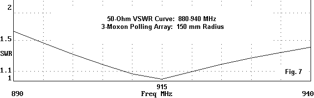 In either form, the 3-Moxon polling array shows a fairly broad operating bandwidth. In terms of operating parameters, here are the numbers for the edges and center of a 50 MHz range from 890 to 940 MHz