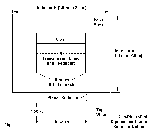 If we place 2 dipoles 1/2 wavelength apart and feed them in phase, we obtain a bi-directional H-plane pattern with a maximum gain that is considerably higher than we can achieve with a single dipole. The maximum gain occurs at right angles to the plane formed by the 2 dipoles, that is, broadside to the pair. The directions that are in line with the dipoles show deep far-field pattern nulls. If we place the dipoles forward of a planar reflector, we should be able to capitalize on a good portion of that gain improvement. Fig. 1 shows the general outline of the scheme.