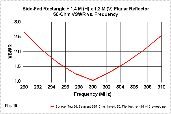 2. The dipole that we used had a diameter of 8 mm and a length of 0.436-m (wavelength). The ideal reflector vertical dimension--in line with the dipole--was 1.2 m (wavelength). The extension of the reflector beyond the dipole at each end was 0.382 m. The remaining question is whether the vertical dimension of the ideal reflector is a function of the dipole length or a function of the frequency of operation. If the vertical dimension is a function of frequency, then the dimension should remain relatively unchanged if we use drivers with different vertical dimensions. If the reflector vertical length is a function of the driver length, then it would likely vary if we use drivers with, for example, significantly shorter vertical dimensions.