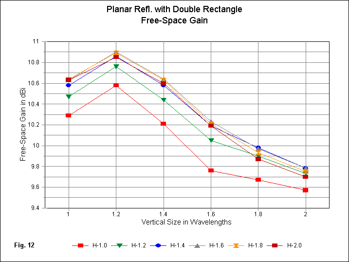 The peak gain occurs, as shown in Fig. 12, with a reflector that is 1.6 m horizontally and 1.2 m vertically. However, the peak gain values for horizontal dimensions between 1.4 m and 2.0 m are so tightly grouped, that the difference in gain among them is not distinguishable. Equally difficult to distinguish is the rate of decrease as we increase the vertical dimension of the reflector. Only the two narrowest reflectors show distinct lines in the graph. The gain values generally coincide with those for the in-phase-fed dual dipole driver, although the rate of decrease after the peak value is a bit more rapid for the double rectangle. The horizontal extension of the reflector when using the peak gain size is 0.45 m past each outer vertical wire, a slightly smaller amount than for the other arrays. However, the convergence of the peak gain values for the 1.6-m and 1.8-m wide reflectors suggests that a true peak gain occurs in the vicinity of about 1.7 m for the reflector horizontal dimension. If that holds true, then the required extension would be closer to 0.5 m, or about the same as for the single rectangle and well within the cluster of extensions required by any of the arrays that we have so far surveyed.