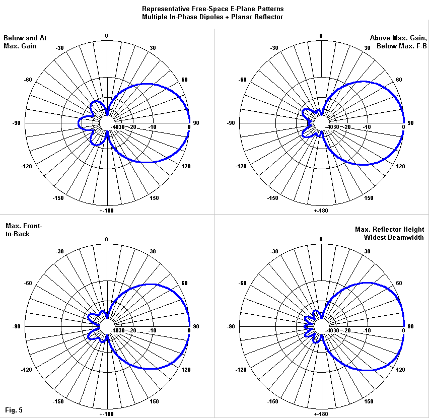 The top two patterns, plus the one on the lower left, show the progression of pattern development from below, through, and above the maximum gain point until we achieve a maximum front-to-back ratio. These patterns come from a smaller reflector horizontally in order to be able to show the maximum front-to-back ratio. Note the emergence and development of a new set of rearward lobes during the progression. As we increase the horizontal dimension of the reflector, we do not reach the point of maximum front-to-back ratio, but we do increase the beamwidth slightly. The lower right pattern shows that condition, with its array of 5 roughly equal-strength rearward lobes. Note that under these conditions, the gain is down by about a dB from its maximum possible value, but the worst-case front-to-back ratio value improves.