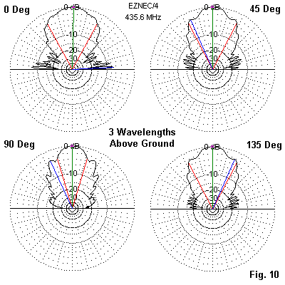 When we examine the 435.6-MHz patterns in Fig. 5, we see the more complex lower lobe structure that goes along with the increase in height. The stronger free-space side lobes at 0 and 90 degrees yield stronger low angle lobes for the array.