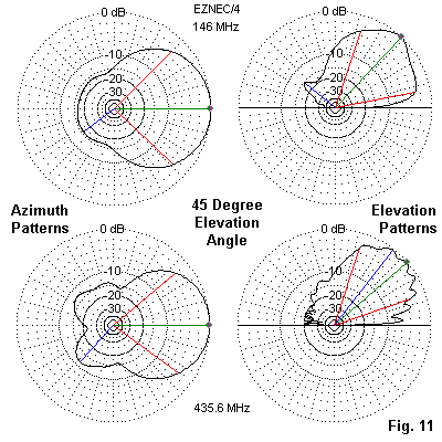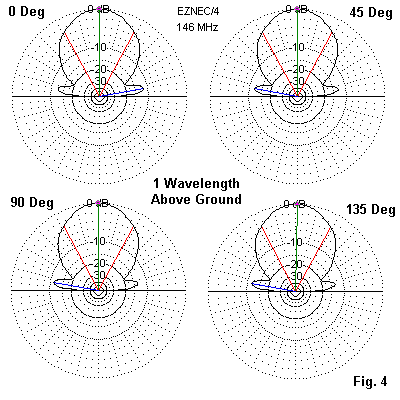 Fig. 7 provides us with the free-space patterns at 146 MHz. The E-plane and H-plane pattern differences are readily apparent. The tiny side lobe in the E-plane becomes a much larger lobe in the H-plane, a phenomenon perfectly normal for both Yagis and quads using linear feed.