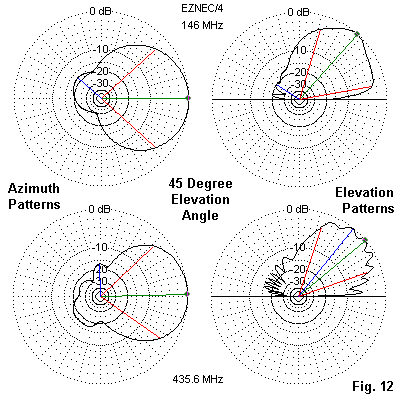 Nonetheless, the arrays maintain good gain, relatively good forward lobe structure, and a good beamwidth. The gain of an array pointed straight upward is normally the sum of the forward gain and the rearward gain, minus any ground losses. Hence, the 2-meter array shows a gain of about 10.4 dBi, while the 435.6-MHz quad yields nearly 10.8 dBi gain. The -3-dB beamwidth is about 57 degrees at 146 MHz and 54 degrees at 435.6 MHz. In both cases, we achieve a good match between the quads--one of the goals of the exercise.