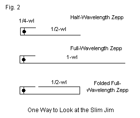 Fig. 2 shows the antenna that we typically think about as an end-fed Zepp: a 1/2 wavelength wire fitted with the 1/4 wavelength matching section. The end of any antenna shows a high impedance as the current goes to zero and the voltage climbs to very high levels. Hence, we may use the same 1/4 wavelength matching section with a wire that is 1 wavelength. Now, suppose that we fold the 1 wavelength back upon itself so that we still have 1 wavelength of wire but fitted into the space required by a half wavelength wire. Surely, some folks reason, we must obtain an advantage by having the long wire.