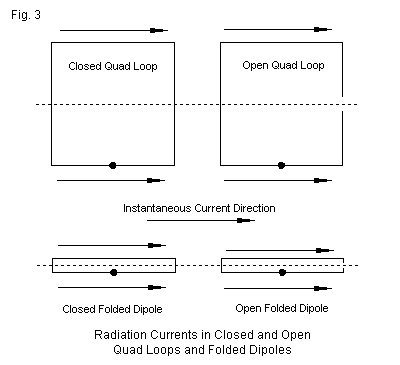 The upper right portion of the figures shows a quad loop with a gap at the far right, that is, at one of the high-voltage, low-current points. If we place a small gap at such a point, we disturb the total continuity of the loop, but perfect continuity is not required for the loop to perform its task just as it would if we closed the loop. (Note: we can only create such a gap at the high-voltage, low-current point of the loop. If we create a gap at the point opposite the feedpoint--a high-current, low-voltage point--we shall change the loop's operation, that is, its pattern and its feedpoint impedance.) You may confirm this matter with any modeling software by comparing gapped and closed loops. As you widen the gap, you will need to adjust the element lengths necessary to sustain a resonant feedpoint. However, by moving in small steps, you will be able to convert named closed-loop antennas into named open-ended antennas, for example, changing a right-angle delta SCV into a half-square SCV.