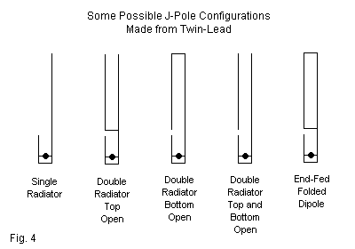 Let's put the account to a test. We may create many J-pole configurations, but we shall need only 5, the ones shown in Fig. 4. The first version is the standard J-pole with a single half wavelength wire as the radiator. (Because we are using a highly interactive radiator and matching system, the radiator of a J-pole is rarely a perfect half wavelength, even accounting for end effect, wire losses, and wire diameter.)