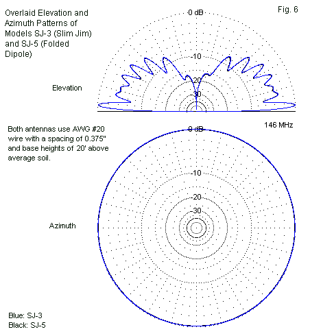 The bottom line is that none of the models shows any operational advantage over any other model in the group. To demonstrate this point, we may overlay the patterns for the slim-jim version (SJ-3) and the folded-dipole version (SJ-5). Fig. 6 shows the result. I know of no way to separate the blue and black lines of the two plots.
