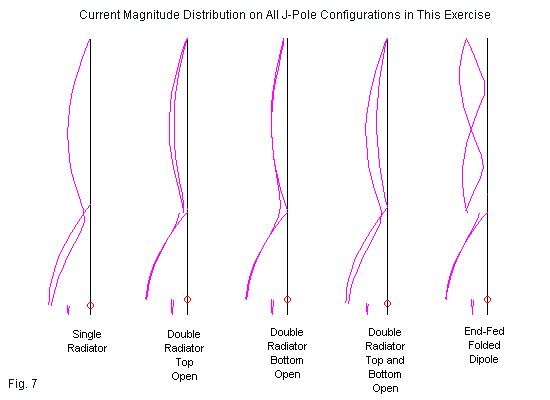 Second, the tightness in the dimension groups among the models that make any connection to a second wire--as well as the performance similarities--should suffice to establish that the slim jim (SJ-3) and its bottom-connected brother (SJ-2) are forms of folded dipoles with a gap in one or the other end. However, one may wonder to what extent a folded dipole with a gap in one end at a high-voltage, low current point acts like a folded dipole, that is, as an antenna having both radiation and transmission-line currents. To satisfy myself on the matter, I examined the current profiles of the radiator sections of all of the models in the group. A graphic representation of the current magnitude distribution appears in Fig. 7.