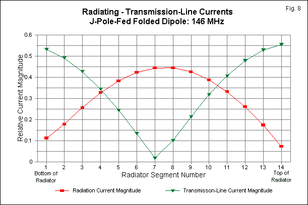 For our purposes, we need only sort the two currents and establish that the radiating current show a relatively normal pattern. Fig. 8 does this job by showing the magnitudes of the two types of current. With respect to the radiation pattern, only the curve for radiating currents is relevant, and its shape is completely normal. We find the maximum current value at about the center point of the radiator section, with values going toward zero at each and. Because the current values in a NEC calculation are taken at the virtual center point of a segment, their values never actually reach zero at element ends.