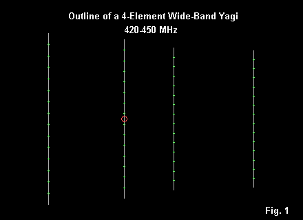 Fig. 1 shows the outline of a wide-band 4-element Yagi. In its design are some of the OWA (optimized wide-band antenna) principles that govern the use of the first director to set--in conjunction with the lengths and spacing of the reflector and driver--the feedpoint impedance curve. However, even OWA principles will not cover the wide passband with an acceptable SWR curve without a second step: using "fat" elements.