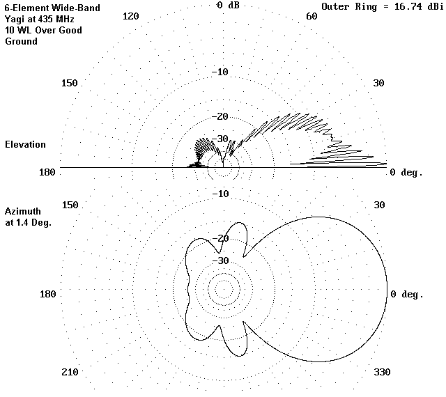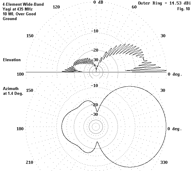 Fig. 10 shows the elevation and azimuth patterns for the 4-element Yagi at 435 MHz. The azimuth pattern is taken at an elevation angle of 1.4 degrees to match the strongest lobe from the elevation pattern. Of special note for those who have not compared Yagis in horizontal and vertical positions is the wider beamwidth for the vertical antenna--about 82 degrees between -3 dB (half-power) points. As well, the rear lobe structure differs considerably from that of the antenna when set up horizontally.