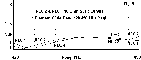 In Fig. 5, I have isolated the NEC-2 and NEC-4 curves for closer examination. Note that there is an approximate 5 MHz displacement of one curve relative to the other. Both curves show the characteristic OWA pattern.