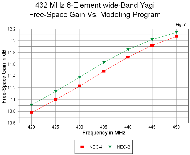 Frequency and Program Parameter NEC-4 NEC-2 420 MHz Free-Space Gain dBi 10.78 10.91 Front-to-Back dB 18.27 19.25 Feed Z (R +/- jX) 44.4 - j 9.6 44.2 - j 8.1 50-Ohm SWR 1.266 1.237 425 MHz Free-Space Gain dBi 11.00 11.14 Front-to-Back dB 21.02 22.48 Feed Z (R +/- jX) 44.7 - j 5.7 44.1 - j 3.9 50-Ohm SWR 1.179 1.161 430 MHz Free-Space Gain dBi 11.23 11.38 Front-to-Back dB 24.43 26.15 + Feed Z (R +/- jX) 44.7 - j 1.0 44.1 + j 1.2 50-Ohm SWR 1.121 1.136 435 MHz Free-Space Gain dBi 11.48 11.63 Front-to-Back dB 25.78 + 25.18 Feed Z (R +/- jX) 45.1 + j 4.3 44.9 + j 6.8 50-Ohm SWR 1.147 1.196 440 MHz Free-Space Gain dBi 11.72 11.85 Front-to-Back dB 22.56 21.11 Feed Z (R +/- jX) 46.6 + j 9.5 47.2 + j11.5 50-Ohm SWR 1.231 1.275 445 MHz Free-Space Gain dBi 11.92 12.02 Front-to-Back dB 19.29 18.22 Feed Z (R +/- jX) 49.5 + j12.5 50.3 + j12.1 50-Ohm SWR 1.285 1.273 450 MHz Free-Space Gain dBi 12.07 12.14 Front-to-Back dB 17.31 16.93 Feed Z (R +/- jX) 50.7 + j 9.7 46.6 + j 5.6 50-Ohm SWR 1.213 1.146
