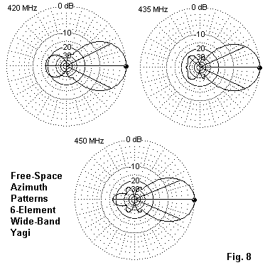 Nonetheless, small wide-band utility Yagis with reasonable patterns and excellent 50-Ohm SWR performance may have a place in some station operations. Wide-band designs can be obtained if one is willing to use larger diameter elements than is conventional for Yagis in the 420-450 MHz band. Application of OWA principles is not limited to a single set of design goals, as the variations between the two designs shown here illustrate.