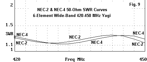 Frequency and Program Parameter NEC-2 MININEC w/corr MININEC w/o corr 420 MHz Free-Space Gain dBi 9.17 9.44 8.93 Front-to-Back dB 11.69 10.79 10.28 Feed Z (R +/- jX) 47.8 - j 1.1 47.4 - j 5.4 37.5 - j13.2 50-Ohm SWR 1.053 1.130 1.520 435 MHz Free-Space Gain dBi 9.33 9.59 9.14 Front-to-Back dB 12.48 12.01 11.86 Feed Z (R +/- jX) 61.0 - j 0.7 50.6 - j16.2 52.5 - j 1.2 50-Ohm SWR 1.220 1.380 1.060 450 MHz Free-Space Gain dBi 9.64 9.90 9.32 Front-to-Back dB 14.99 15.31 12.92 Feed Z (R +/- jX) 42.7 - j 6.6 24.8 - j 9.2 60.0 - j 4.9 50-Ohm SWR 1.236 2.110 1.220